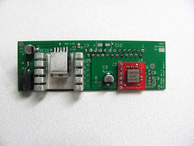 The board provides a 150 degree/sec yaw gyro and 12 volt regulated power for the Kinect. Note that the voltage regulator has an enable pin so that it can be automatically disabled to stop the Kinect from pulling more current than the charging system is capable of providing.