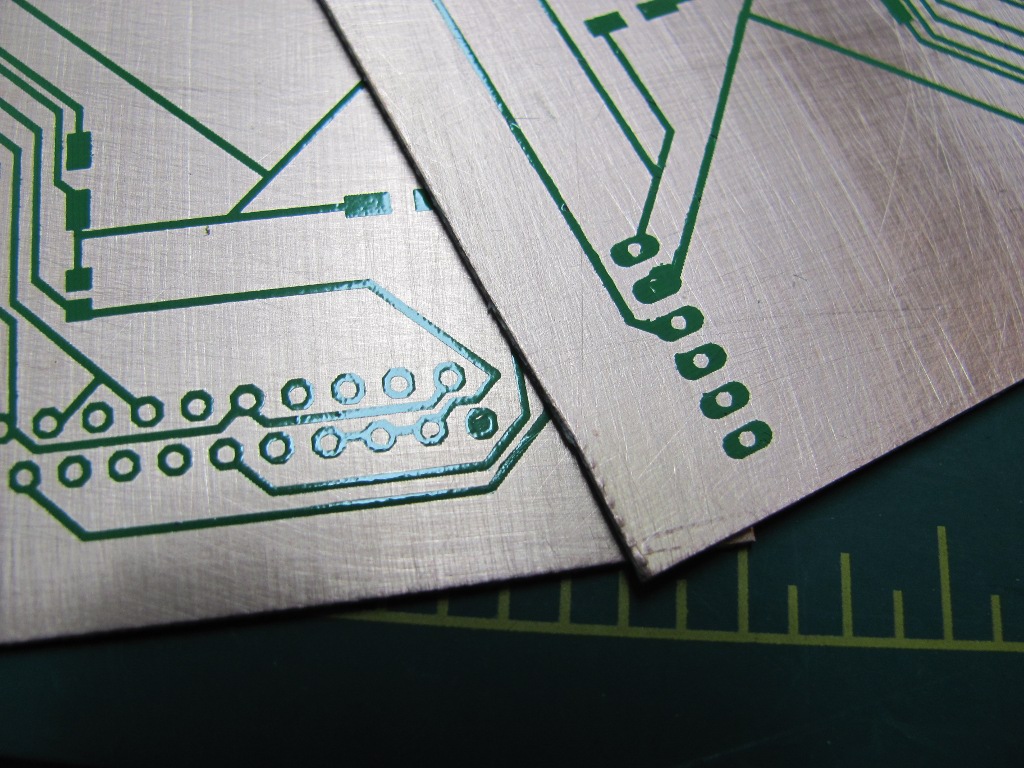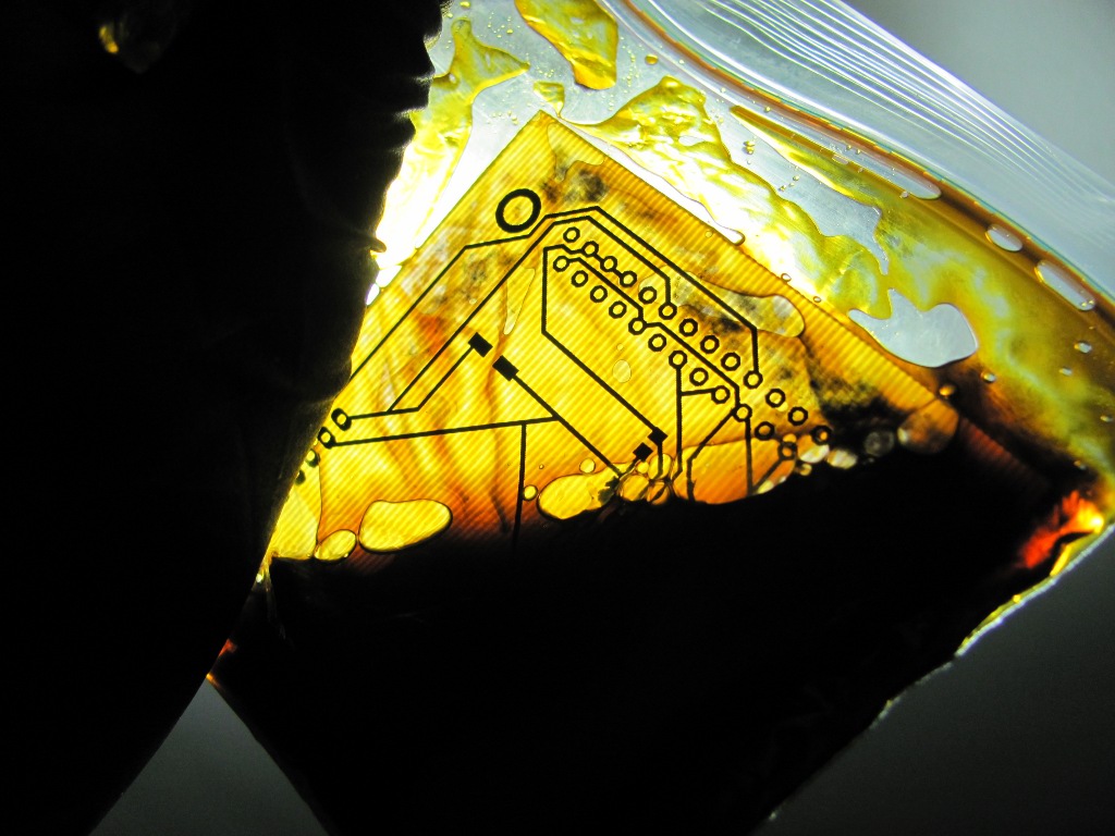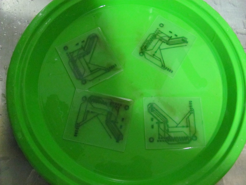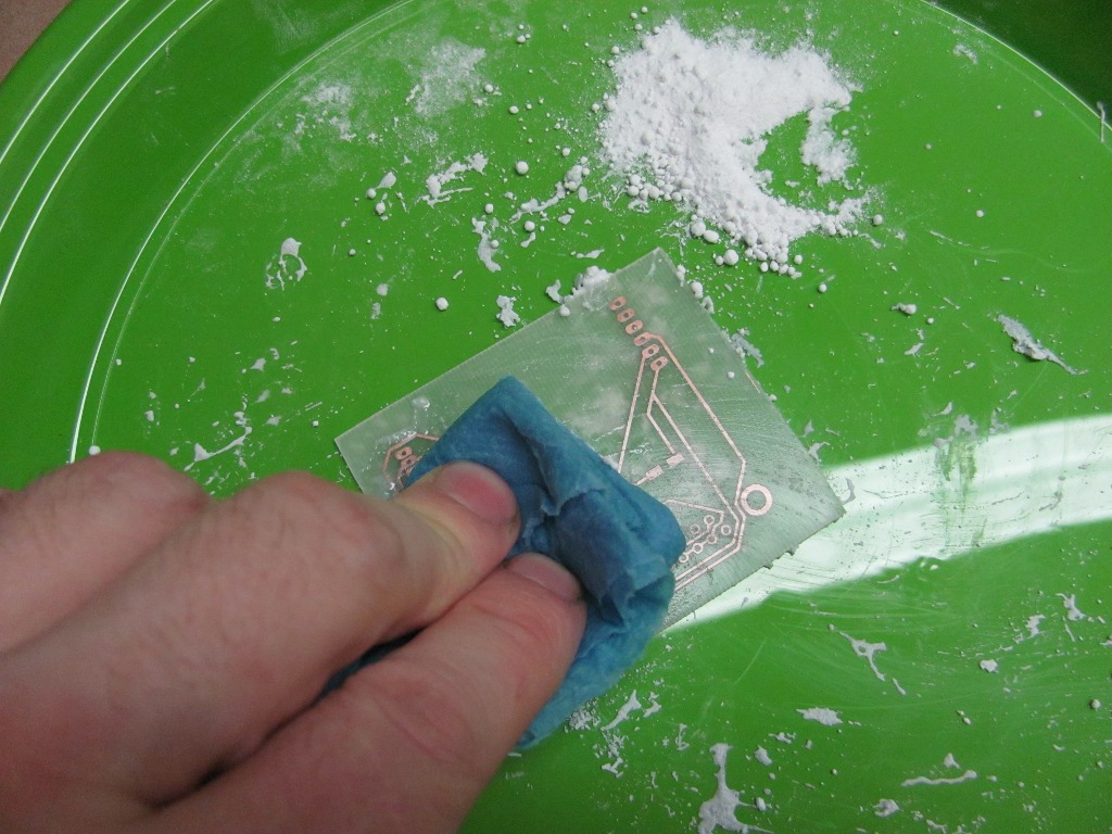 To remove the resist, the boards are soaked in acetone and scrubbed gently.