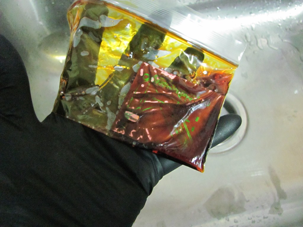 This is the resulting mess created by etching four boards and the used etchant has been placed in a sealed glass container for resue.